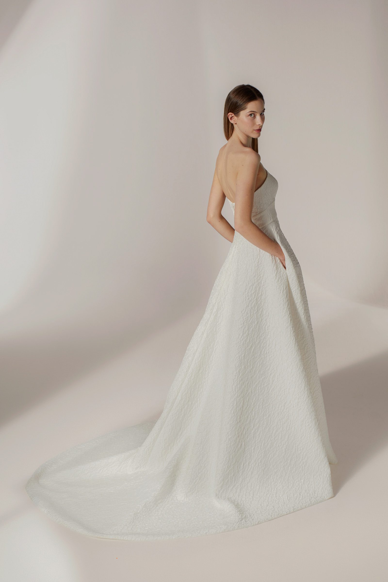 Jesus Peiro 2614 Wedding Dress – Strapless dress with crescent shaped neckline, fitted at the waist and large volume skirt. Crafted in geometric brocade with inner corset structure