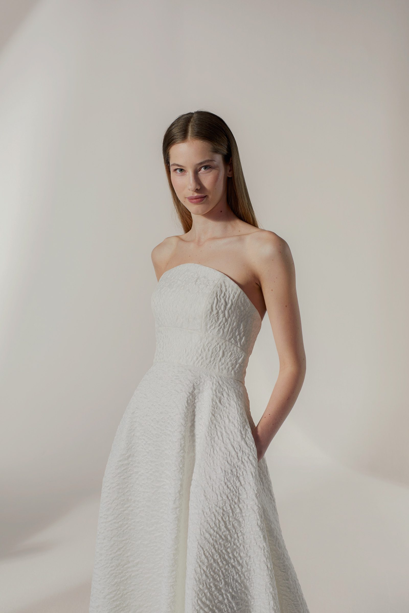 | Details | Natural Waist, Strapless Neckline, Pocket Details, Texture Detail. |