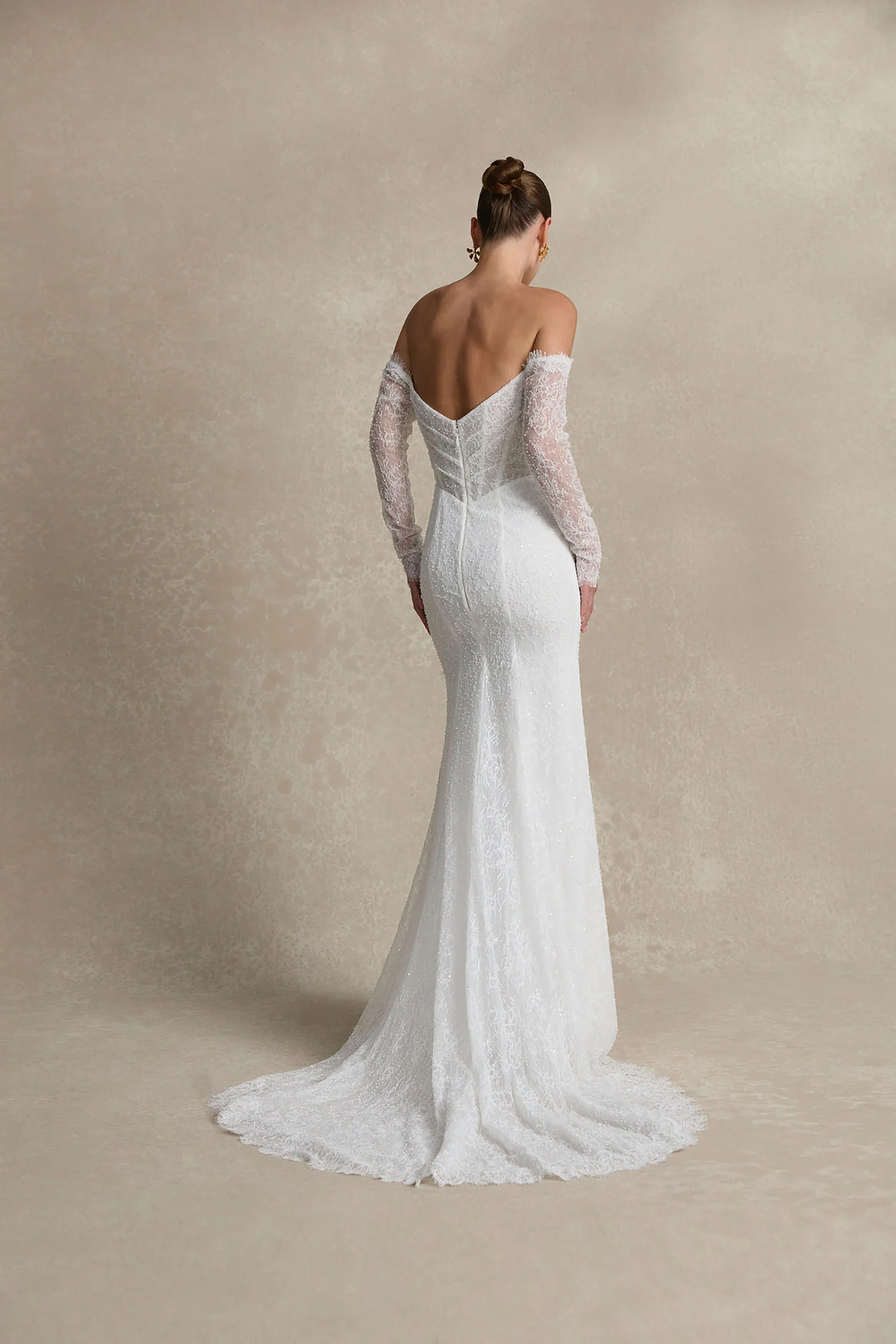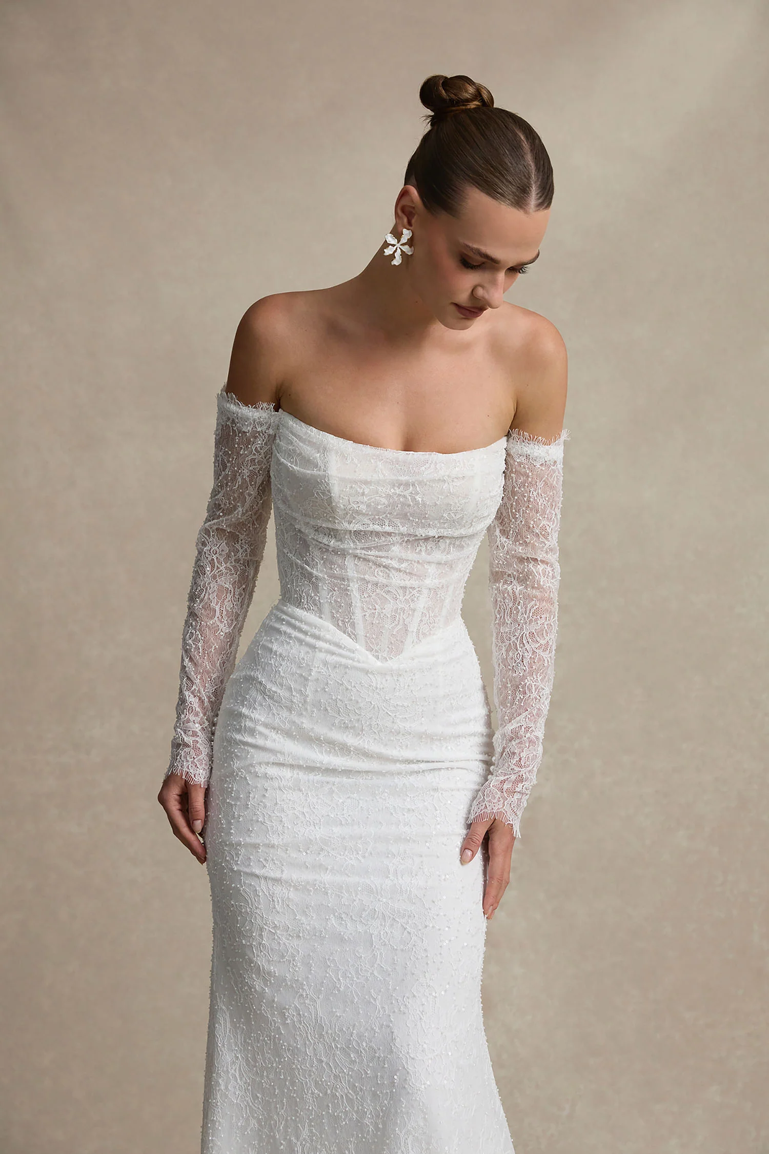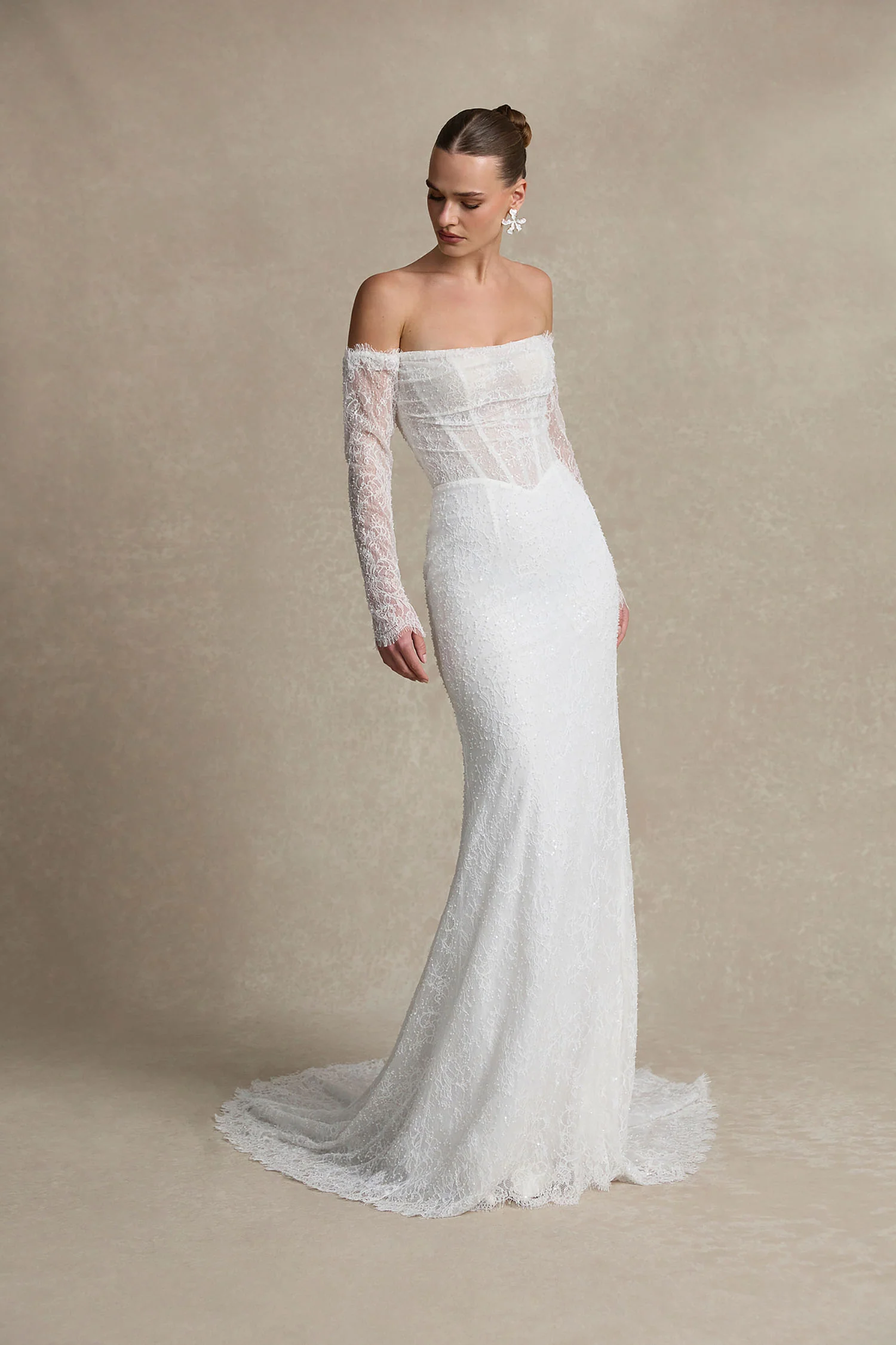 La Premiere Bronwyn Wedding Dress – Modern Romantic Fit and Flare Bridal Gown with Basque Waist, Straight Strapless Neckline, Detachable Long Sleeves, Corset and Beaded details with a Chiffon and Organza Fabric.