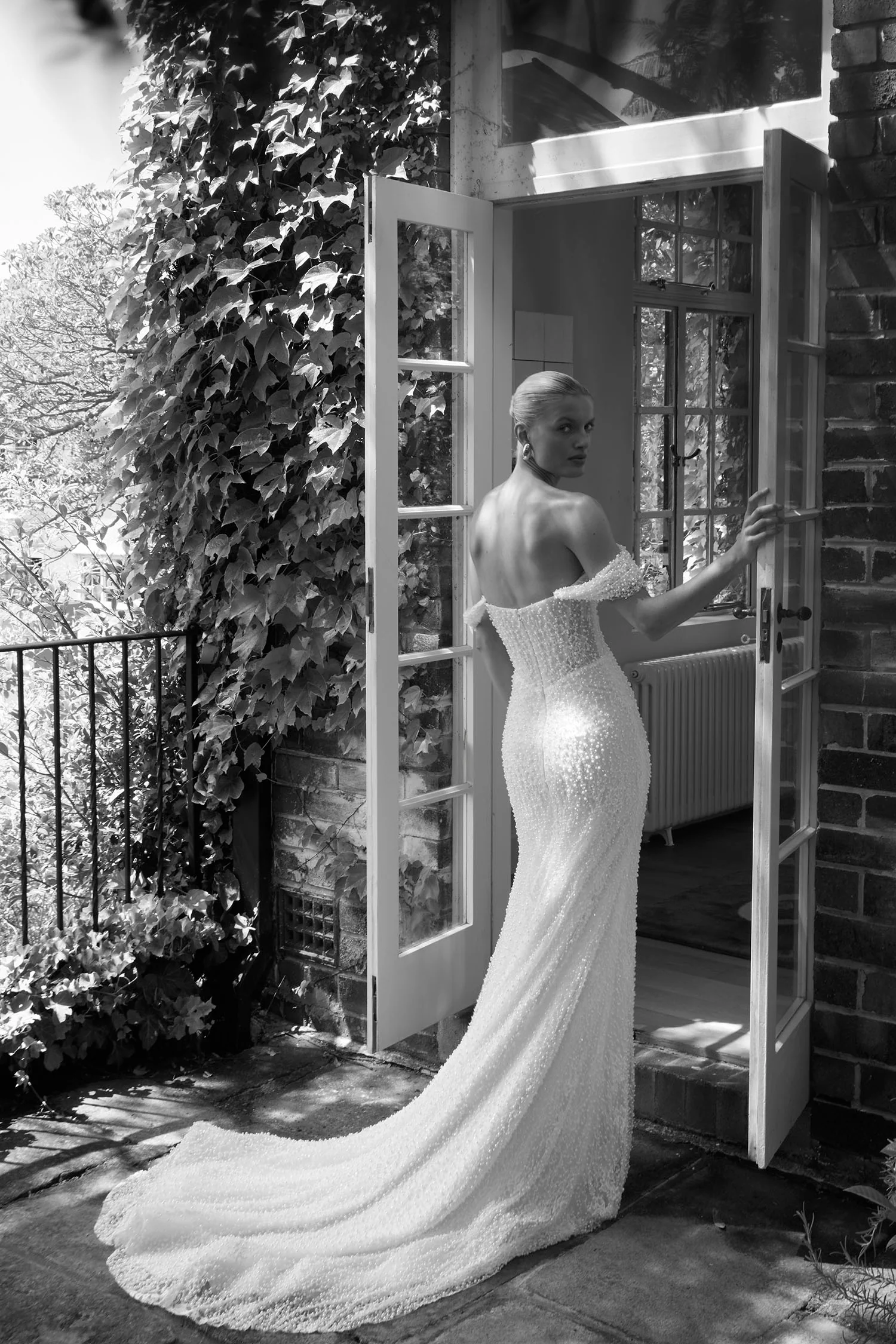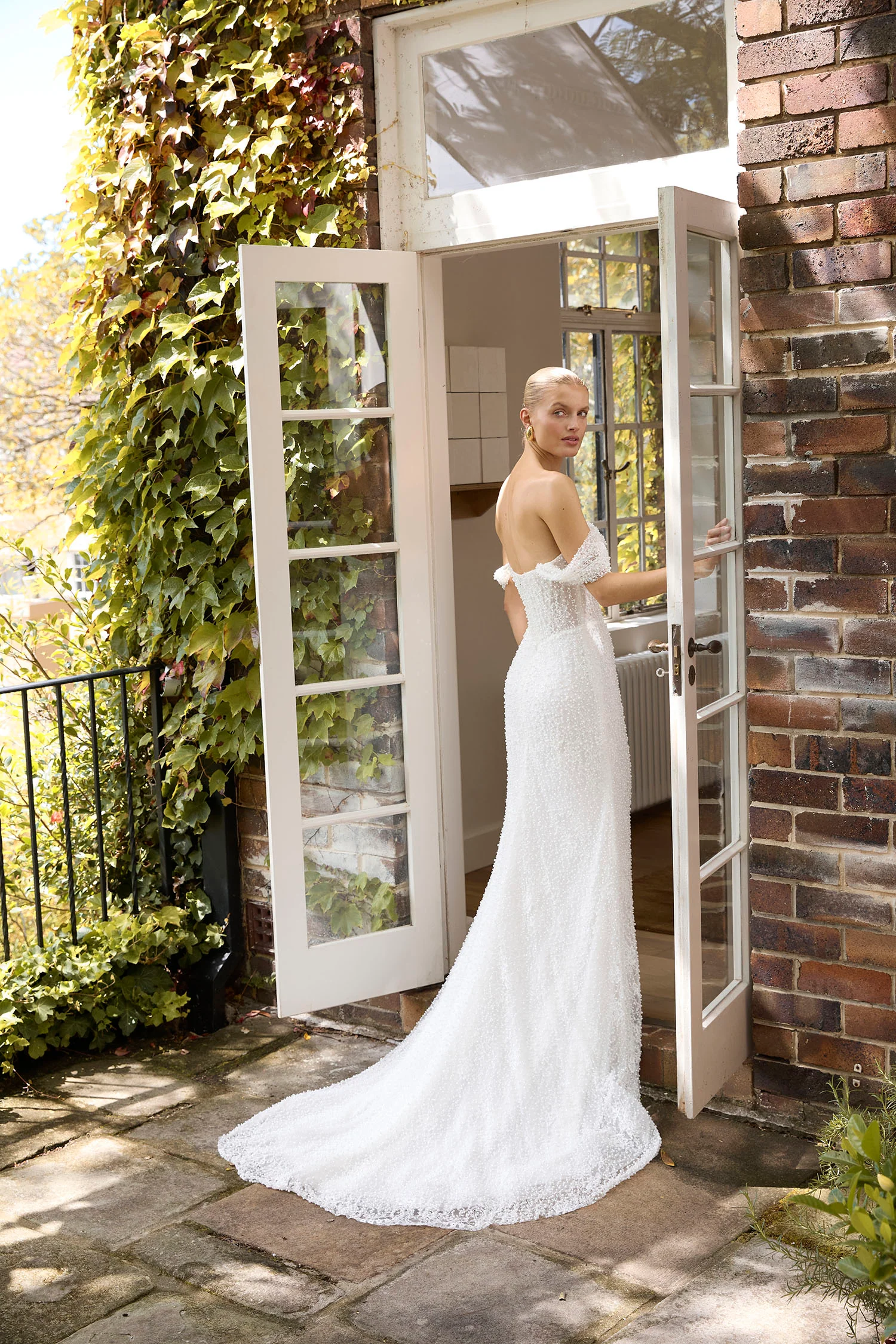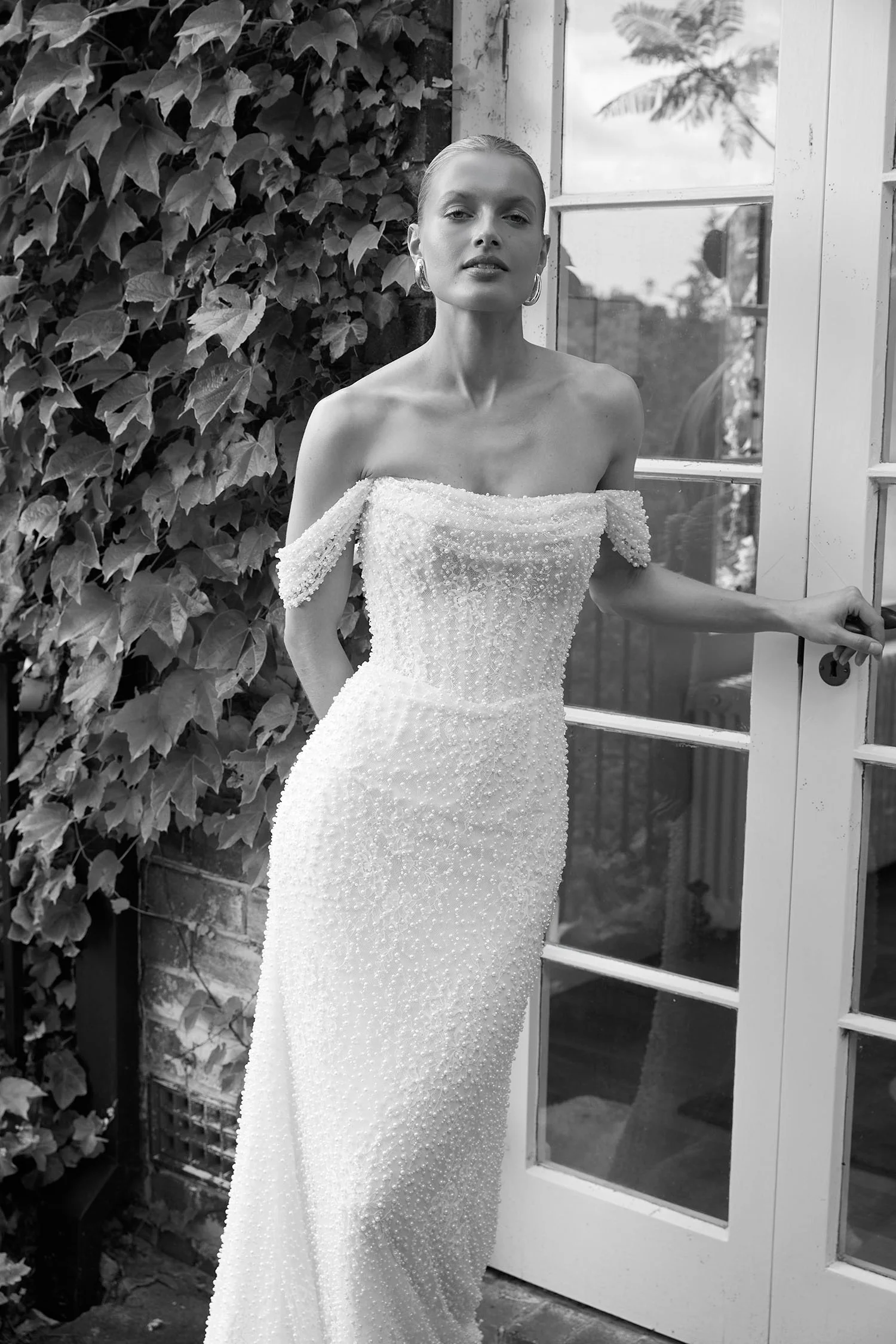 La Premiere Blair Wedding Dress – Romantic Couture Mermaid Bridal Gown with Basque Waist, Off the Shoulder Strapless Neckline, Detachable Cap Sleeves, Pearl Beaded Details and Lace Fabric.