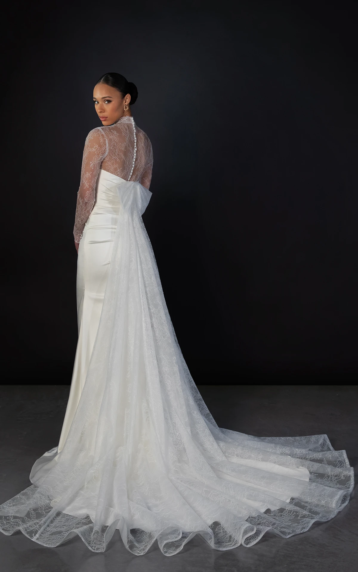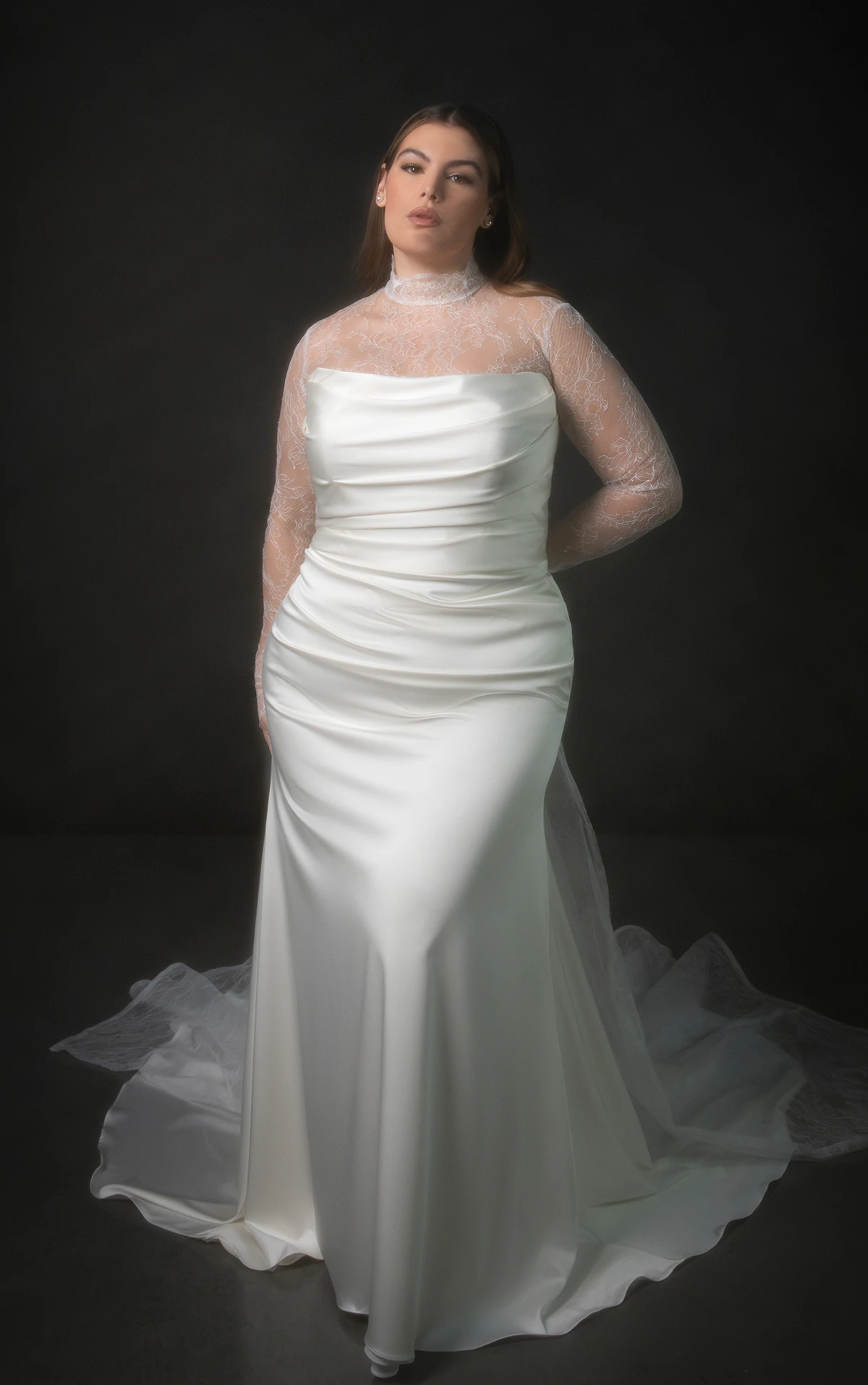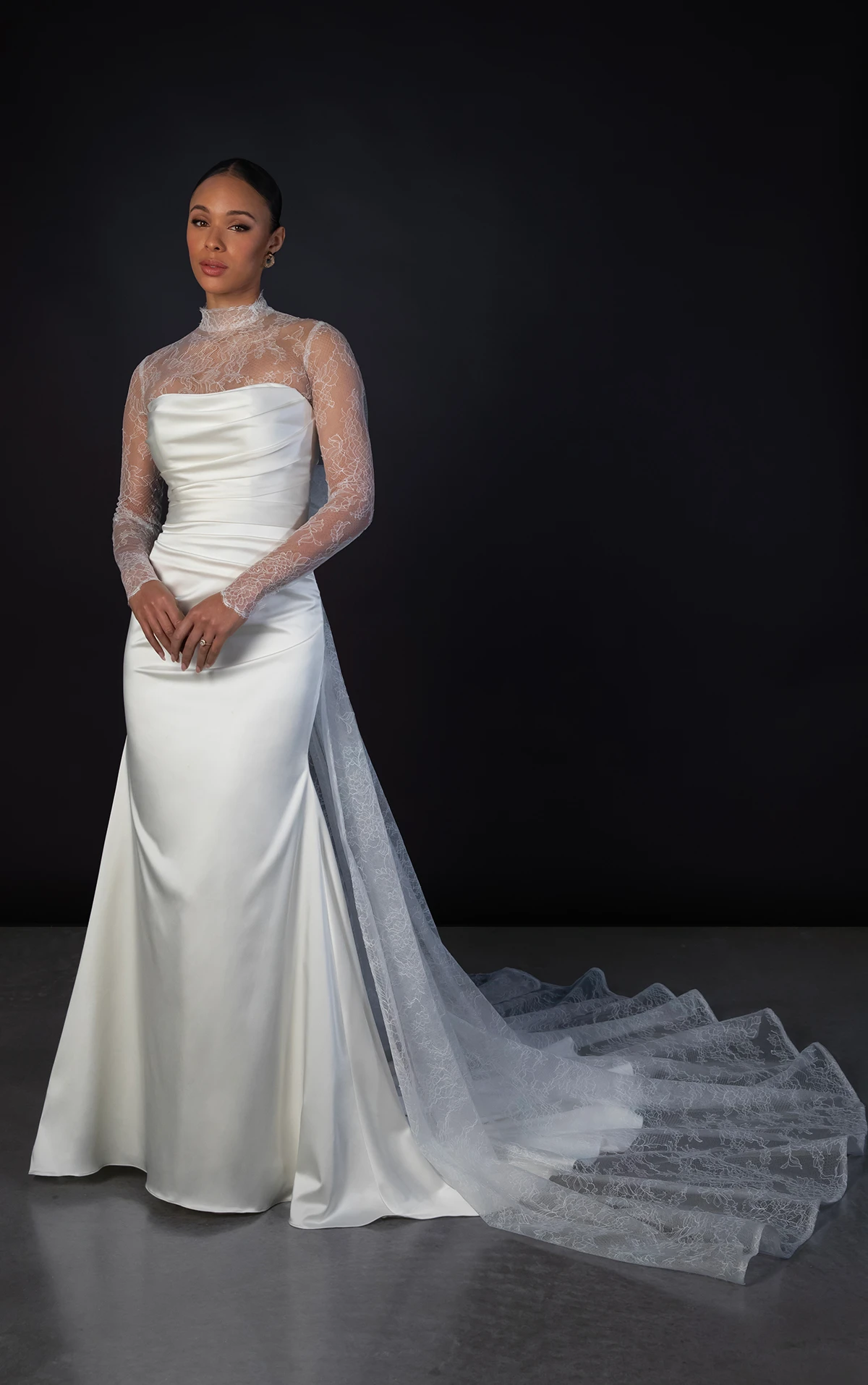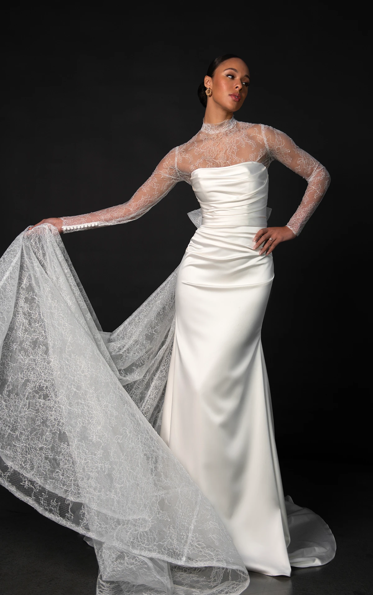 Martina Liana 1874 Wedding Dress – Modern dress in charmeuse fabric featuring a detachable long sleeve lace topper, detachable lace train and ruched at the back hip. The draped strapless bodice scoops at the neckline and wraps around the figure, ending with a gown-length row of fabric-covered buttons.