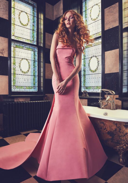 Sareh Nouri Naomi Wedding Dress – Classic Fit And Flare Bridal Gown with Princess Seams, Bateau High Neck Neckline, Back Details, Low Back, Bows and, Mikado Fabric